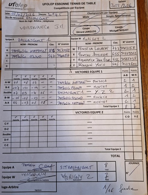 Comme prévu, Laurent remporte son simple contre Bruno. Le dernier simple oppose donc Dominique à Matthieu. Notre représentant va-t-il déjouer les pronostics et apporter le point de la victoire ? Malheureusement, au terme d’un beau combat, Dominique perd en quatre sets.