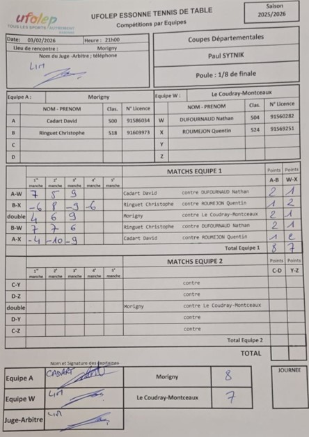 Ce soir, le duo Christophe & David a montrĂ© qu’il constituait une bonne Ă©quipe de coupe. En effet, chacun a remportĂ© son simple contre Nathan et ils se sont imposĂ©s dans le double. Rendons hommage Ă  Quentin qui a gagnĂ© ses deux simples. RĂ©sultat, Morigny 1 l’emporte 3 matchs Ă  2 (8 points Ă  7).