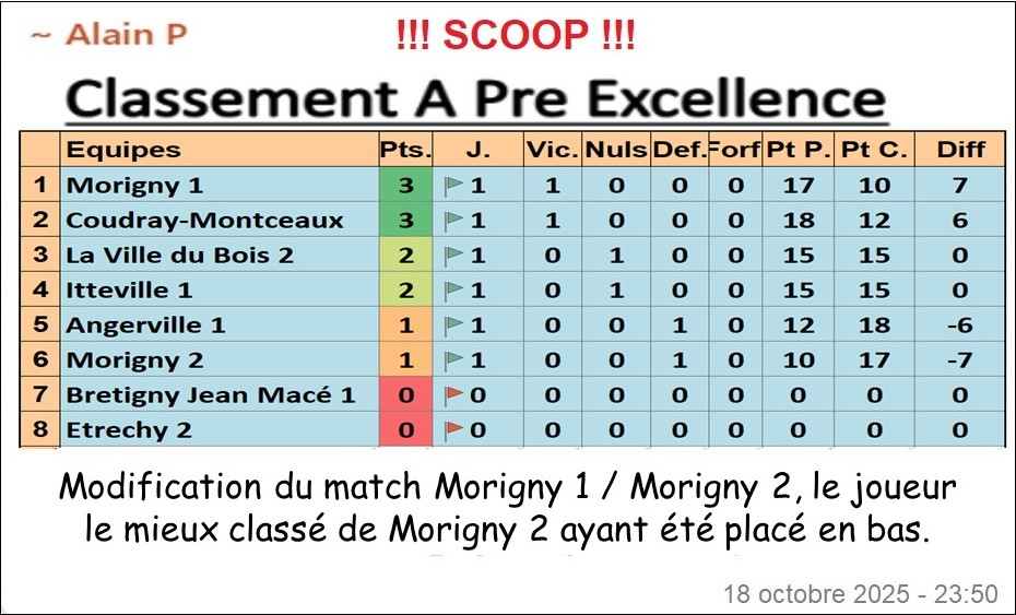 L’Ă©quipe de Morigny 2 vient d’ĂȘtre dĂ©classĂ©e par les responsables UFOLEP en raison d’un vice de procĂ©dure. Bernard, le mieux classĂ© de l’Ă©quipe, aurait dĂ» ĂȘtre placĂ© en haut de la feuille. Par consĂ©quent, les matchs auxquels il a participĂ© (simples contre François et Laurent et double) sont considĂ©rĂ©s comme perdus.