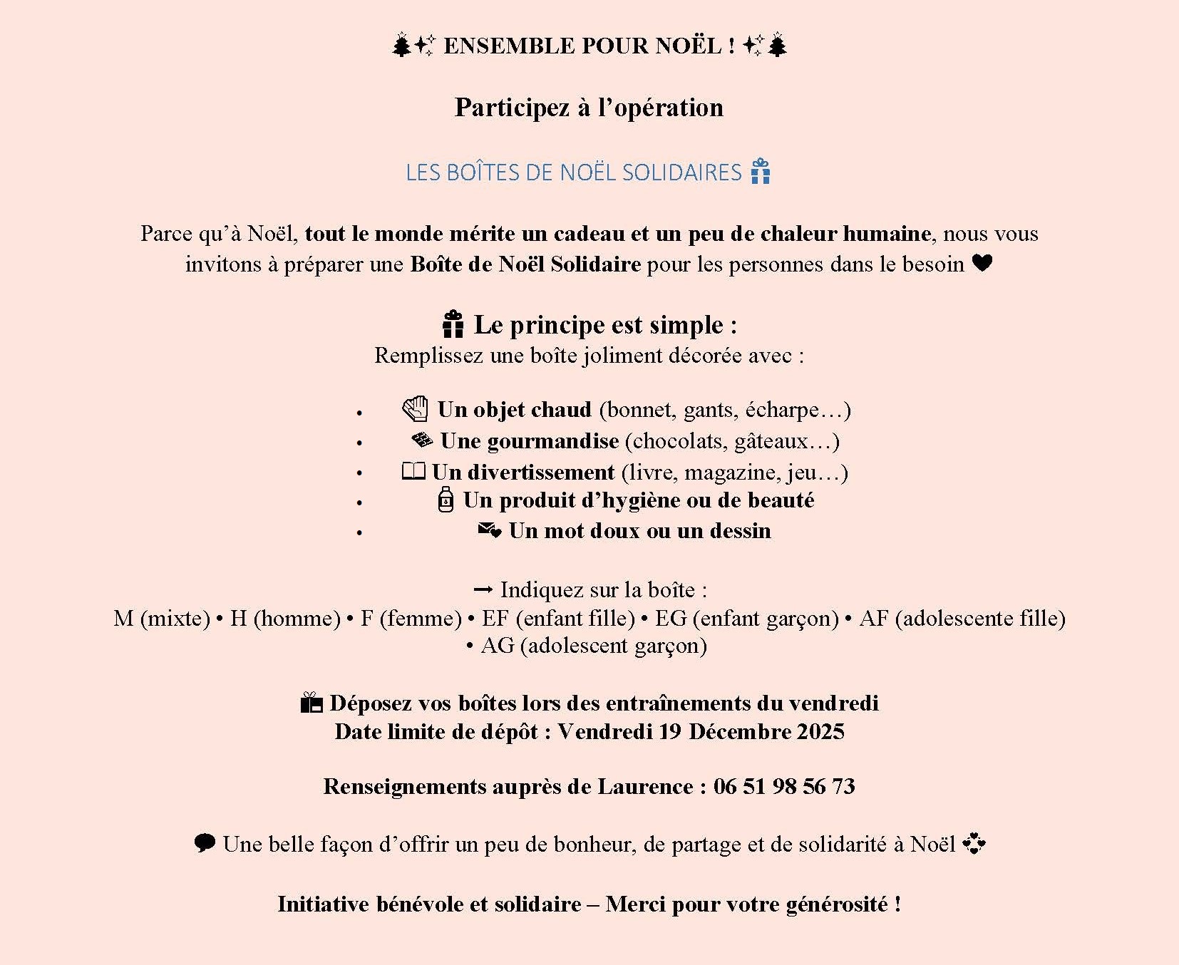 19 Décembre 2025 : Date limite de dépôt des BOÎTES DE NOËL SOLIDAIRES.