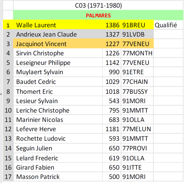 Comme toujours, ce critérium régional a été d’un très bon niveau, avec par exemple la présence de joueurs classés jusqu’à 17 en C5. Le titre est revenu aux Seine et Marnais dans 7 catégories sur 11 ! Pour l’Essonne, notons que les « vieux » ont su tirer leur épingle du jeu en obtenant les titres en C3 (Laurent de Breuillet), en C1 (Philippe de La Ville du Bois) et en C0 (Eric d’Etréchy, que nous connaissons bien à Morigny !). En double dames, le titre s’est partagé entre les deux départements.