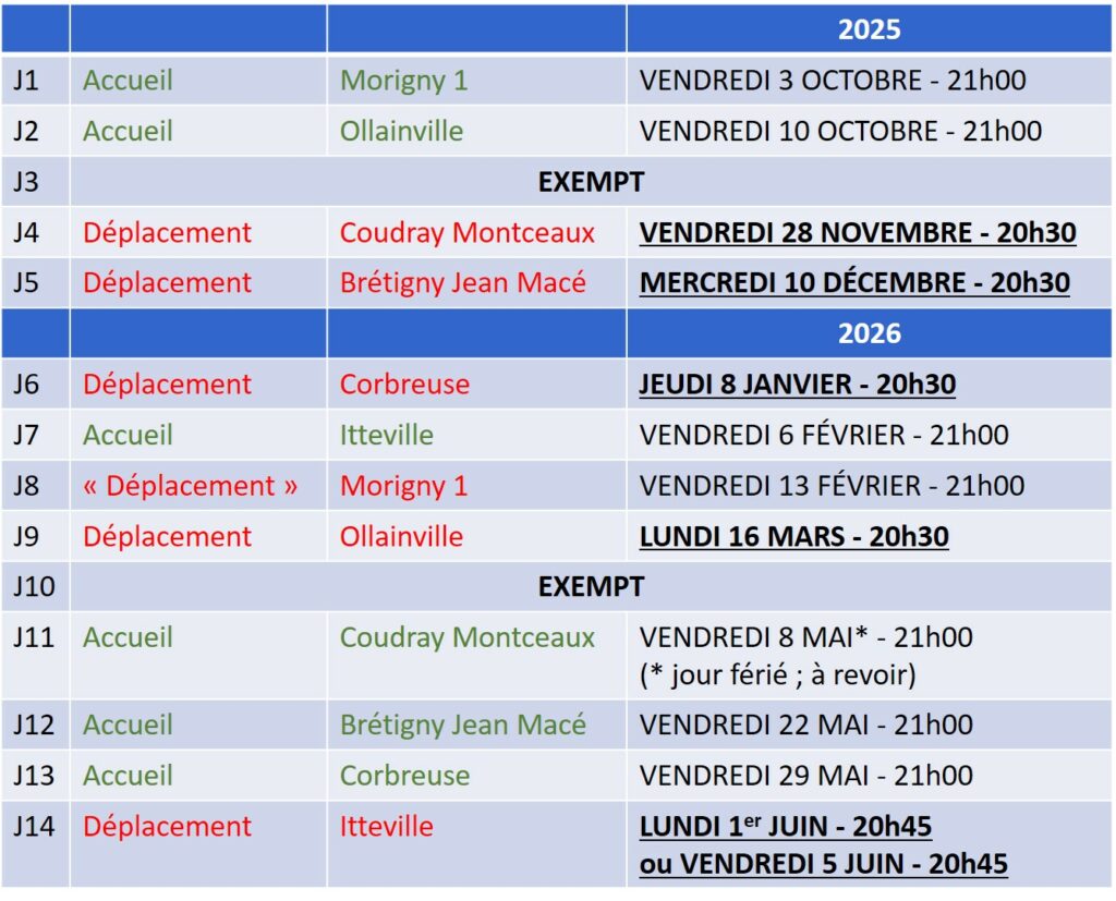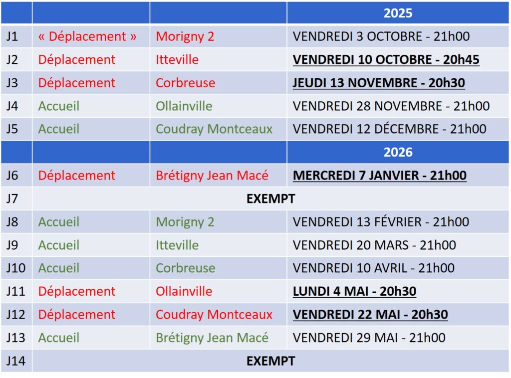Prochains matchs le Vendredi 10 Octobre : Morigny 1 se déplace à Itteville et Morigny 2 accueille Ollainville.