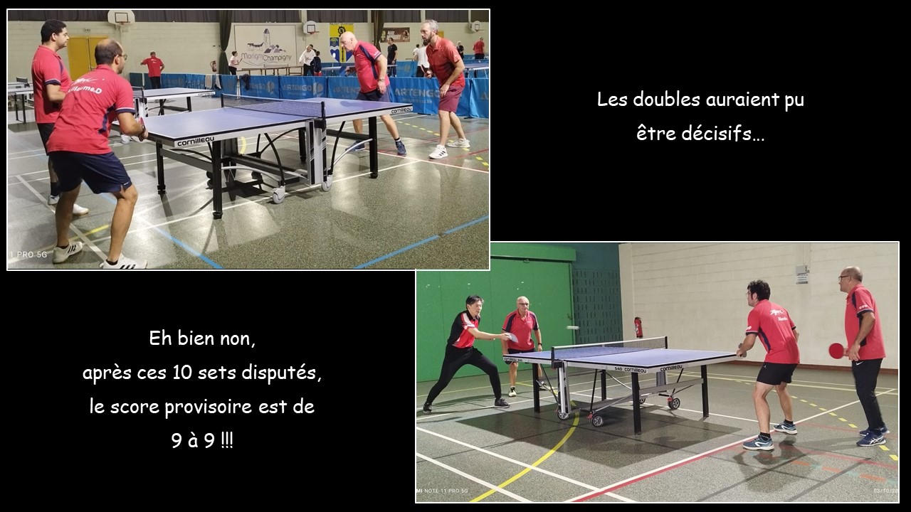 En bas de tableau, saluons la très belle entrée en compétition de Christophe, qui est venu à bout de Guillaume en quatre sets, a poussé Ulysse jusqu’à 12/10 au 4ème set et ne s’est incliné qu’au 5ème set en double avec Christian. A l’image de Steve, mention spéciale à Ulysse, invaincu en simples comme en double, avec Guillaume. Décidément, ce dernier confirme ses performances de la saison dernière dans cette discipline, quel que soit son partenaire. Mais pour son 2ème simple, bien que bataillant ferme contre Christian, il s’est incliné au 5ème set. La feuille de match en témoigne : Morigny 1 (bas de tableau) = 7 ; Morigny 2 (bas de tableau) = 8.
