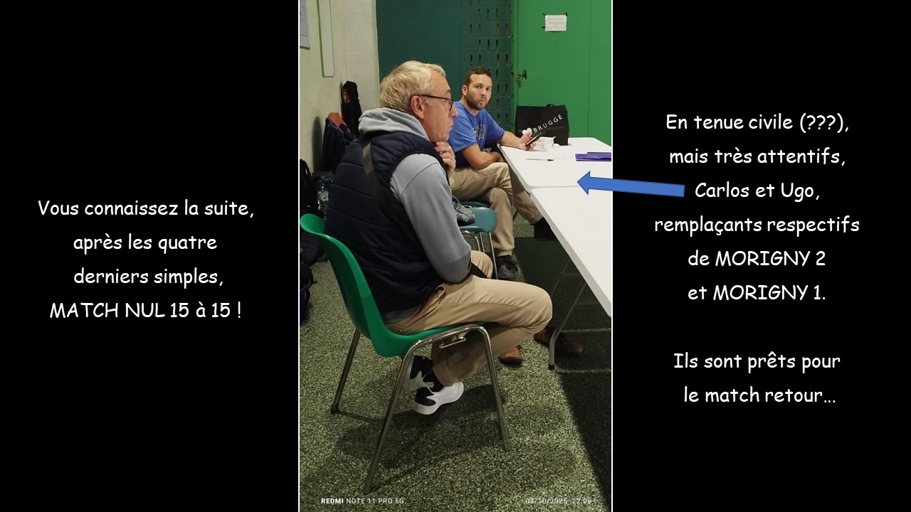 Morigny 1, l’équipe visiteuse, alignait Christian, Christophe, Laurent et Steve (2454 points au total si le classement de Steve à 700 est confirmé). Morigny 2 était composée de Alexis, Bernard, Ulysse et Guillaume DEL. (2542 points).